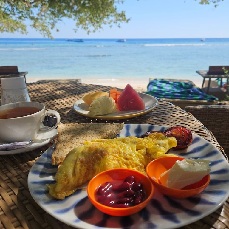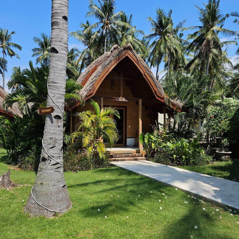 L’hôtel propose des vélos, des transats sur la plage, une piscine, et même du matériel de snorkeling si tu n’en as pas. C’est clairement l’adresse idéale si tu veux profiter de Gili Trawangan sans son image “party island”.