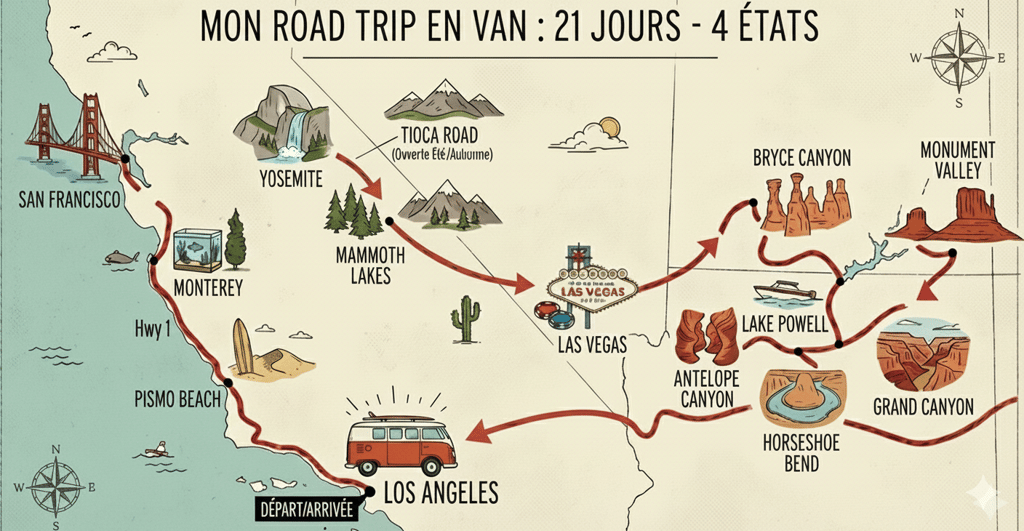 Partir 3 semaines dans l'Ouest américain est une aventure incroyable. J'ai parcouru 4 États (Californie, Nevada, Utah, Arizona) dans un van que j'appelais "ma maison". Voici le détail de mon parcours, mes bonnes adresses et ce que j'ai appris en chemin.